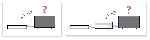 If your TV is connected to an A/V device (like a Blu-ray player) through an audio system (like an amplifier or theater stand) , make sure the audio system is set to the input where the A/V device is connected. The image below shows an example of this setup.
